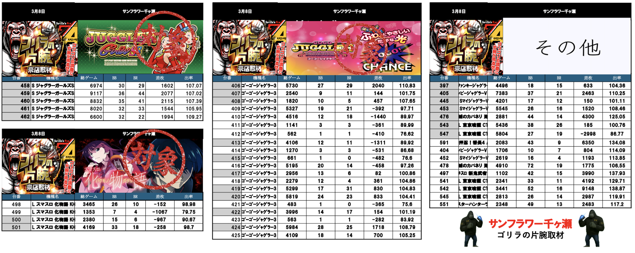 ※本レポートは、ホールで公開されているデータを「調査員」が独自集計し、 編集したものになります。 数値はあくまでも独自調査のものになるために内容を保証するものではありません。 次回の立ち回り参考資料としてご活用ください。