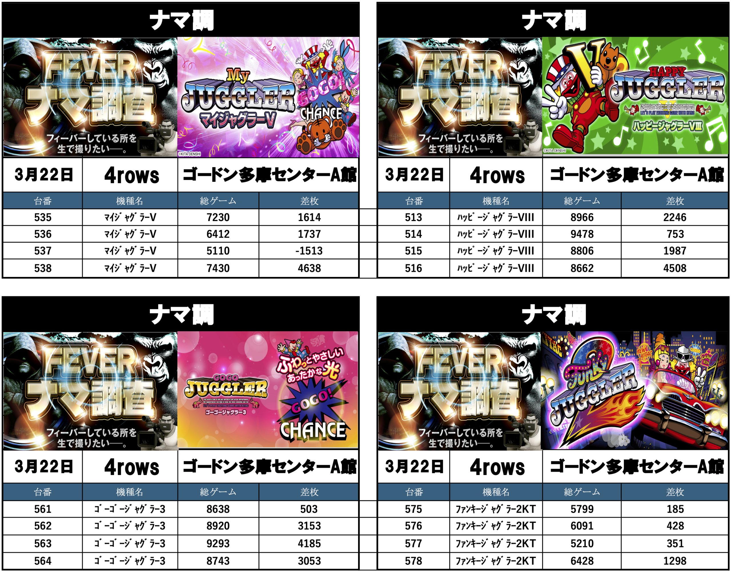 ナマ調の結果レポートになります。YouTubeチャンネル「feverナマ調」が当日の現地調査で独自に集計し注目機種の挙動をまとめたものになります。