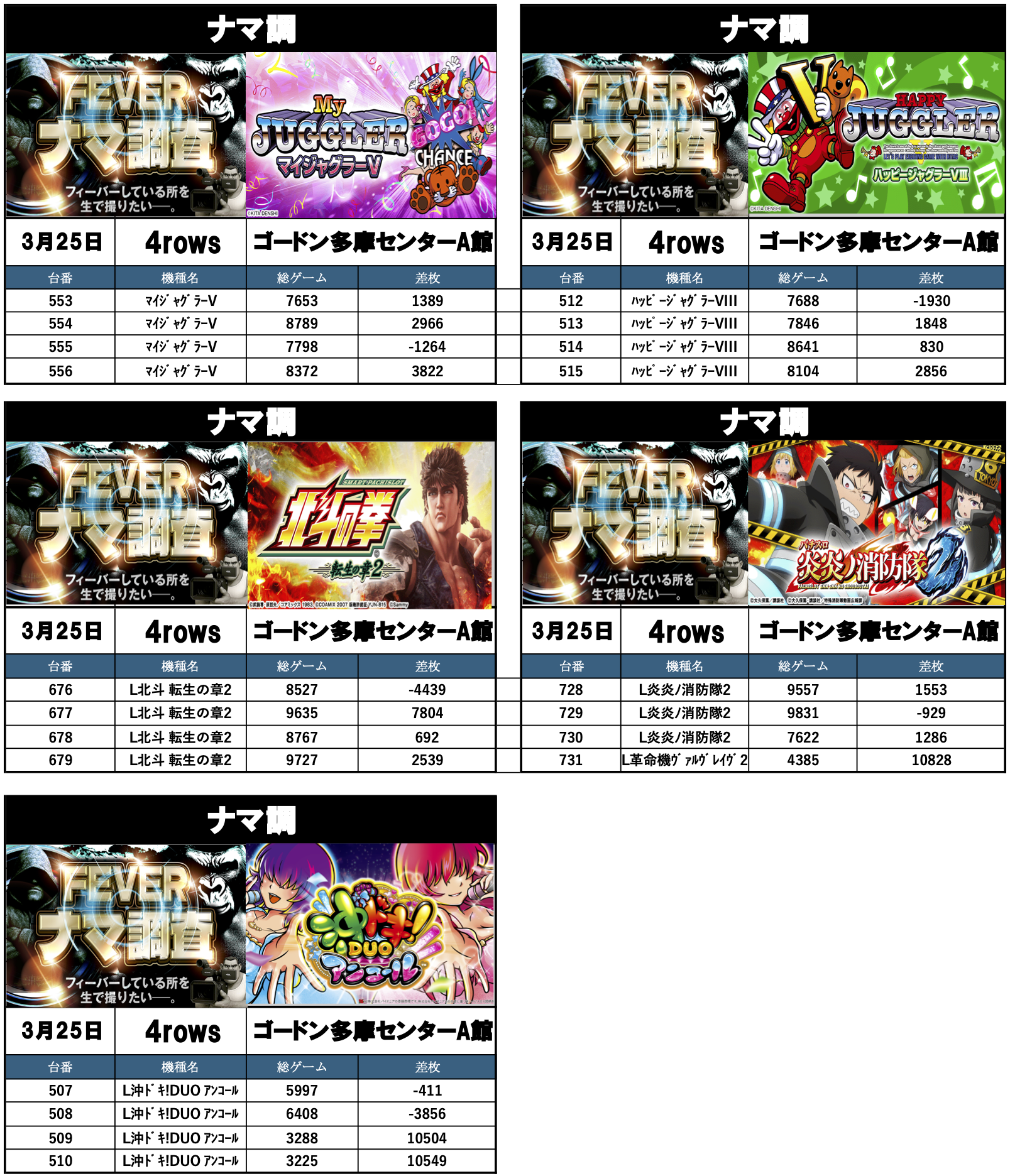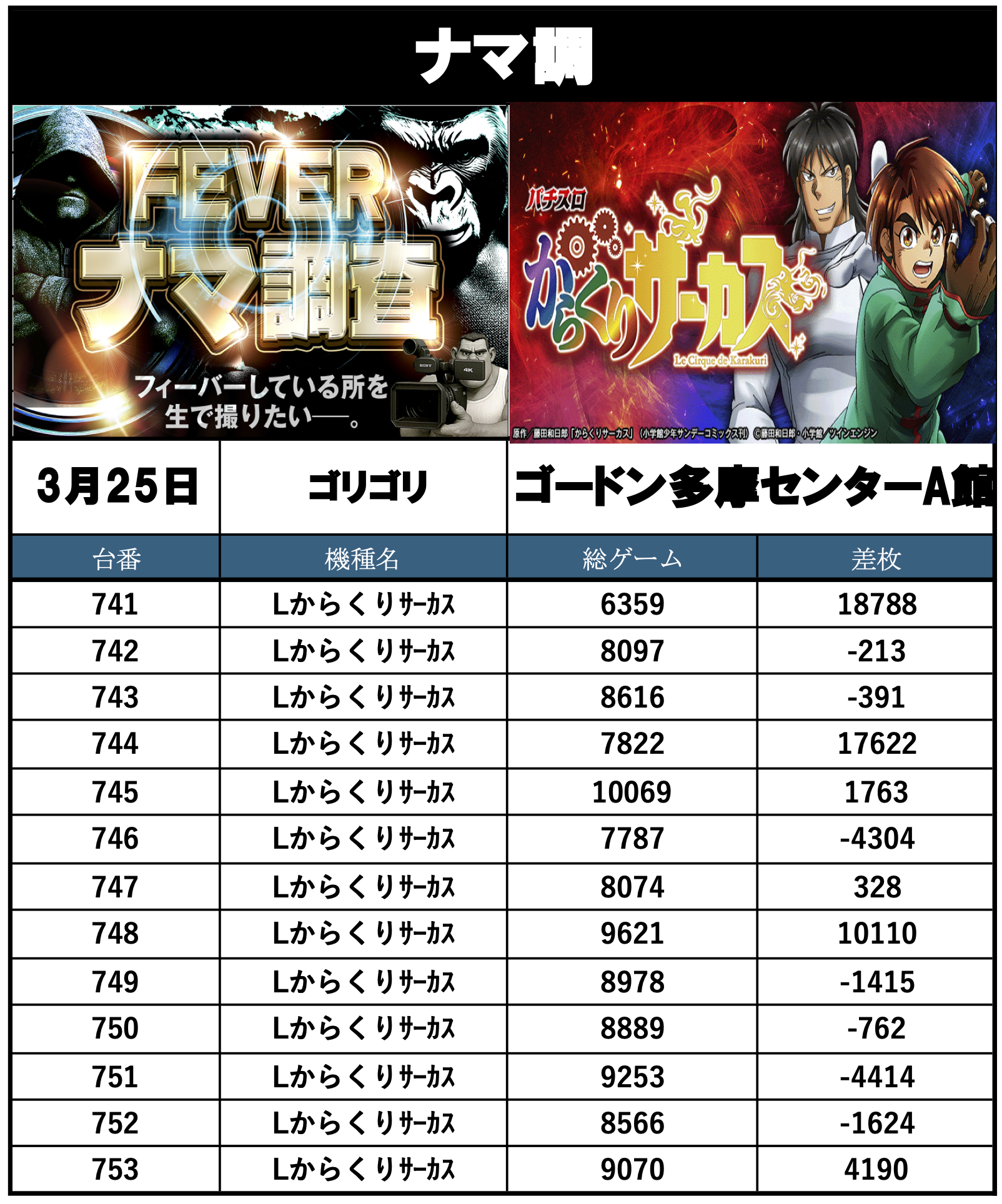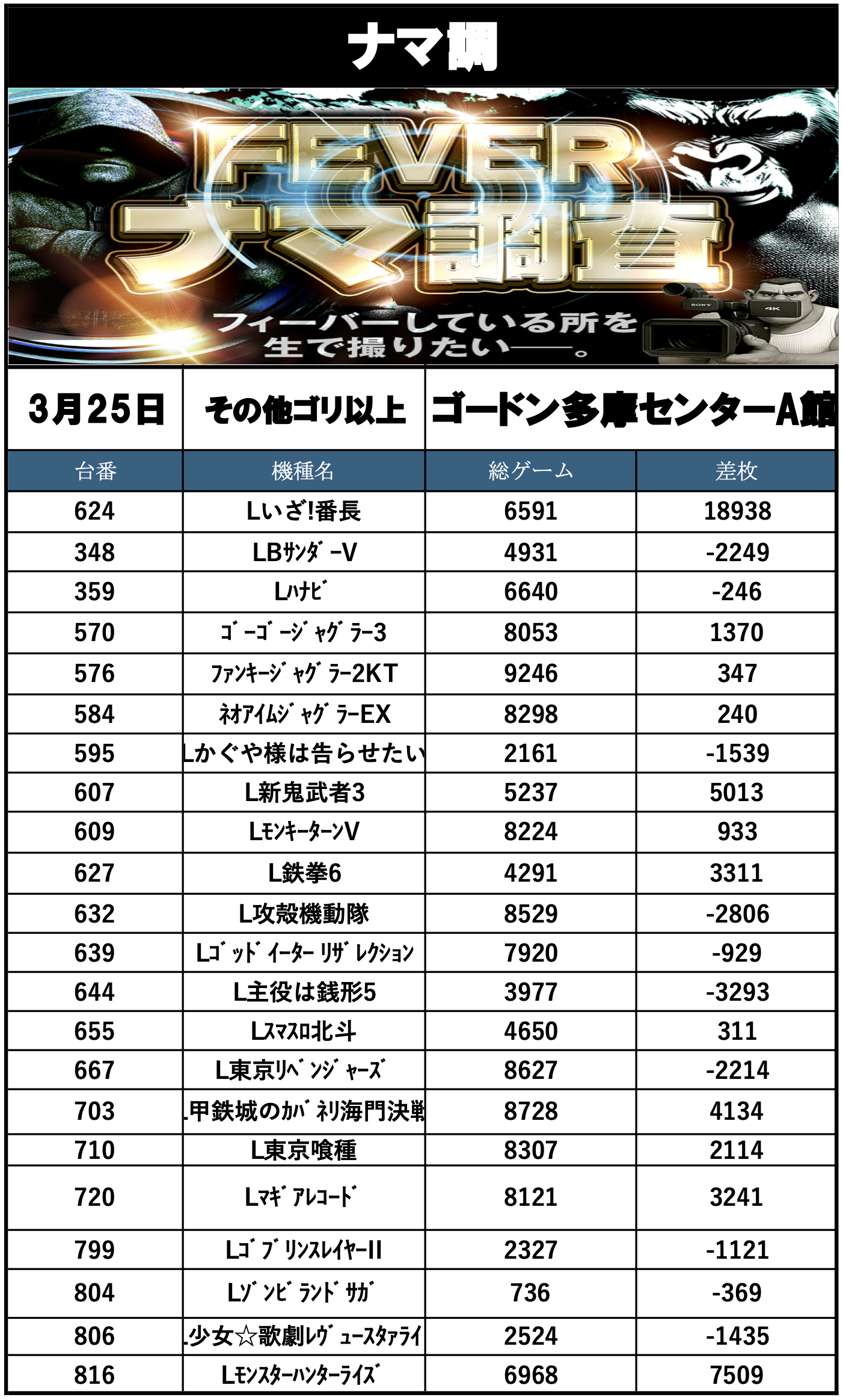 ナマ調の結果レポートになります。YouTubeチャンネル「feverナマ調」が当日の現地調査で独自に集計し注目機種の挙動をまとめたものになります。