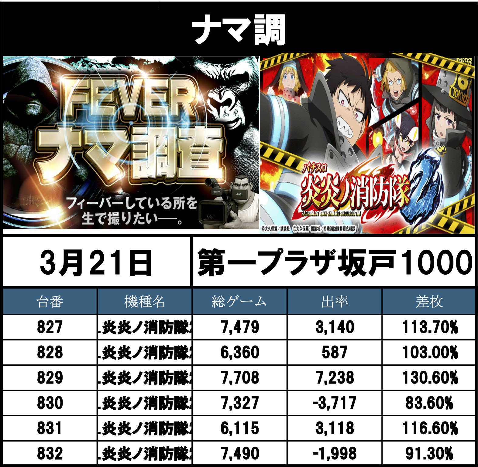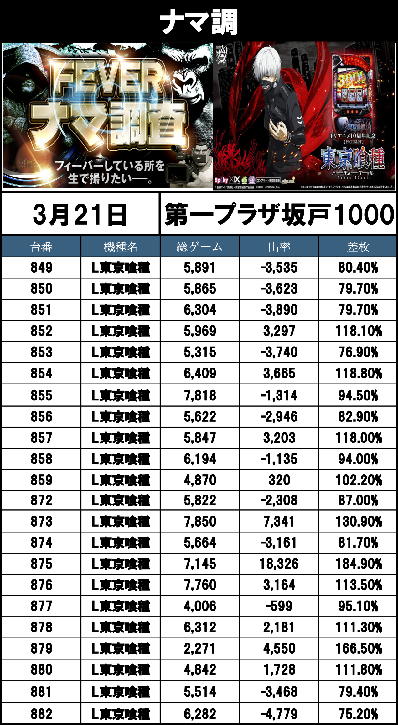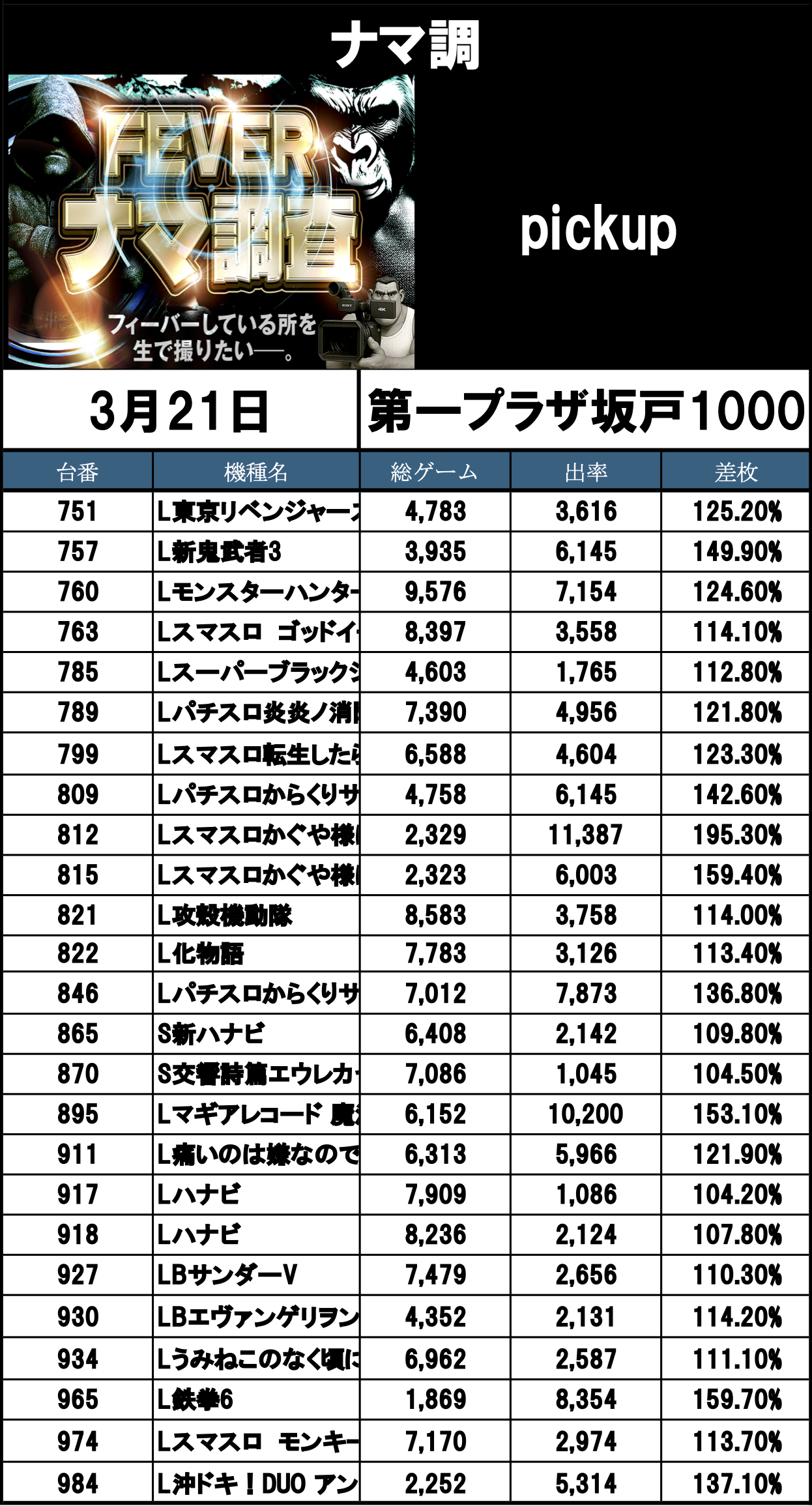 ナマ調の結果レポートになります。YouTubeチャンネル「feverナマ調」が当日の現地調査で独自に集計し注目機種の挙動をまとめたものになります。