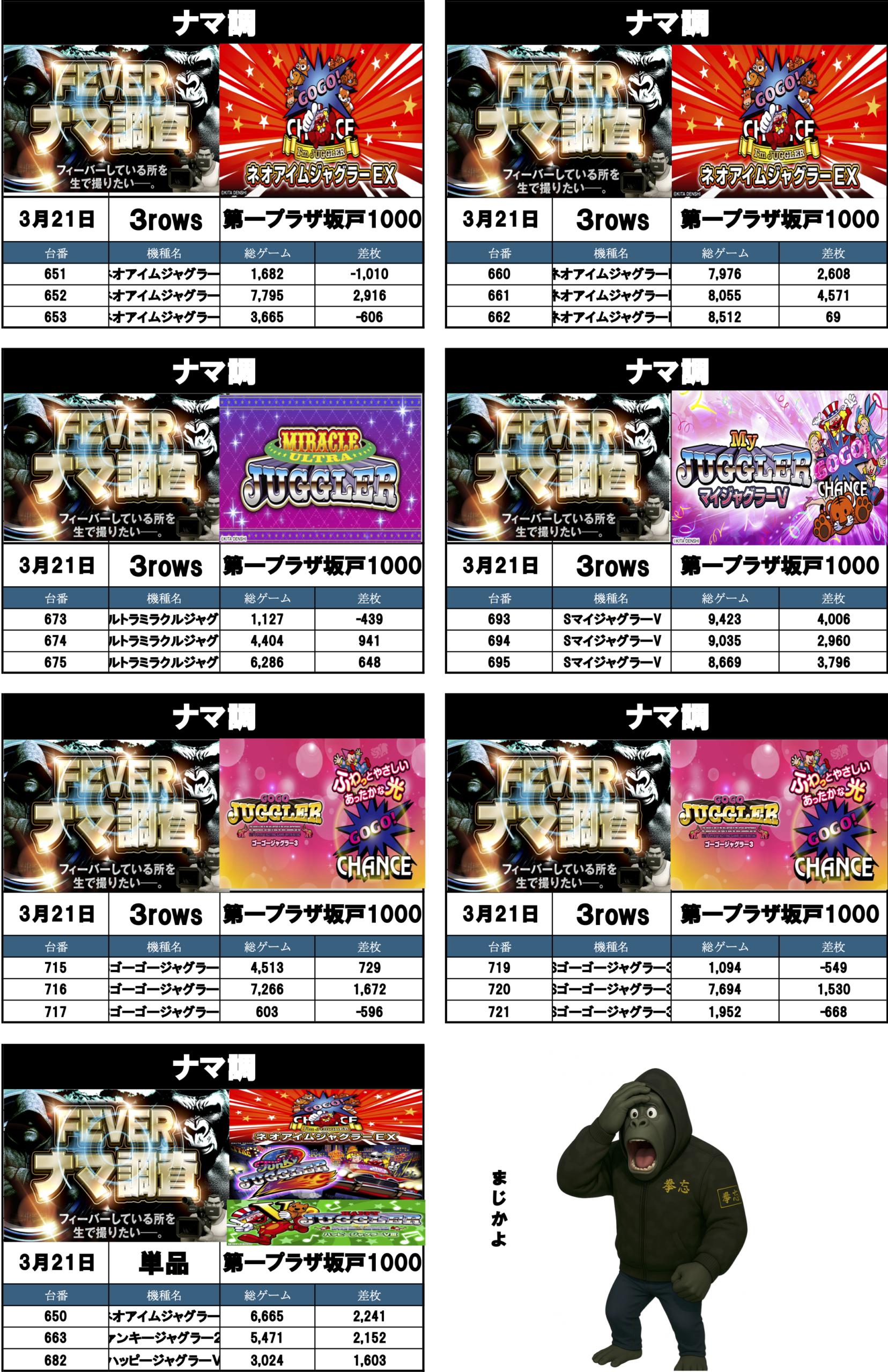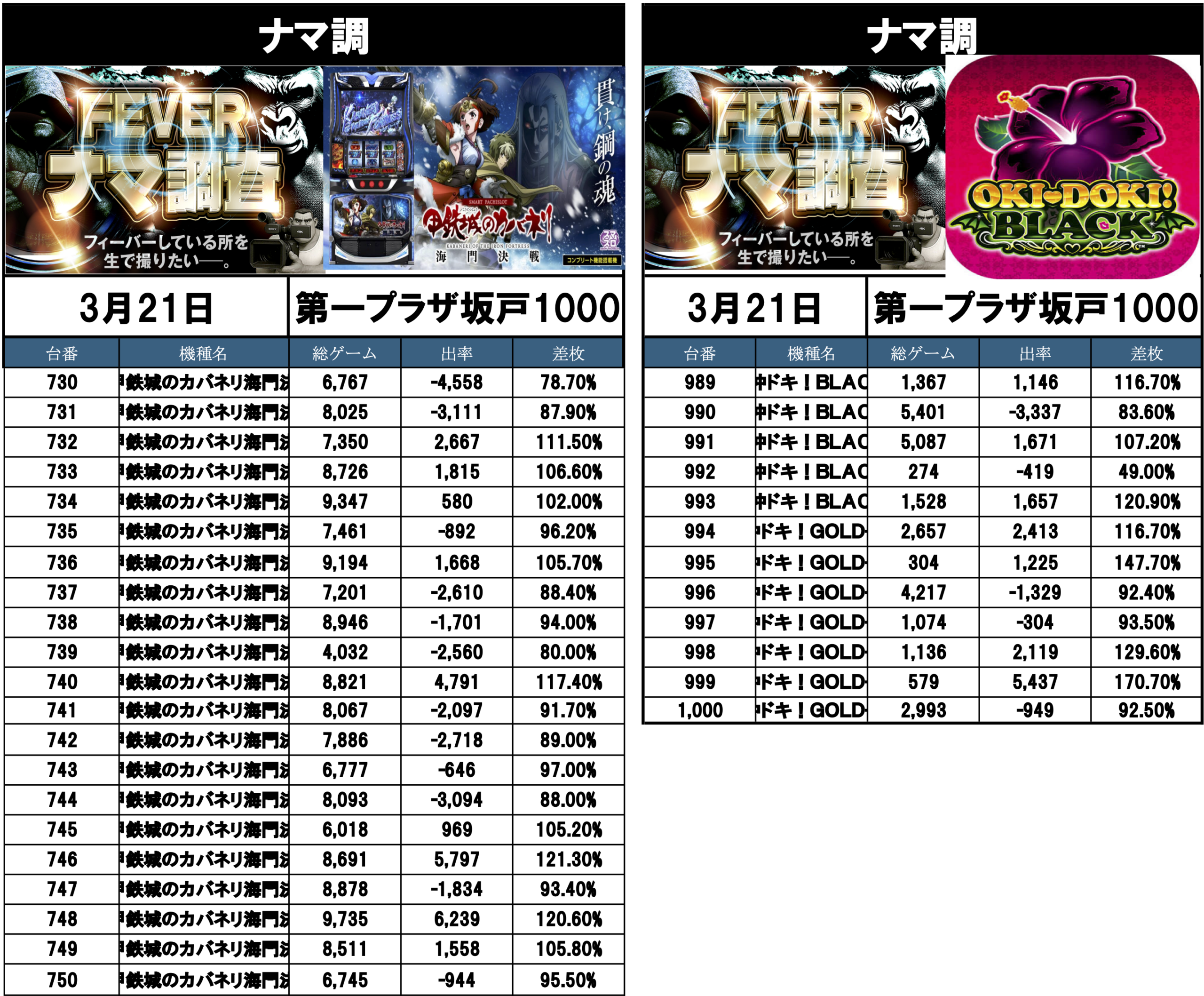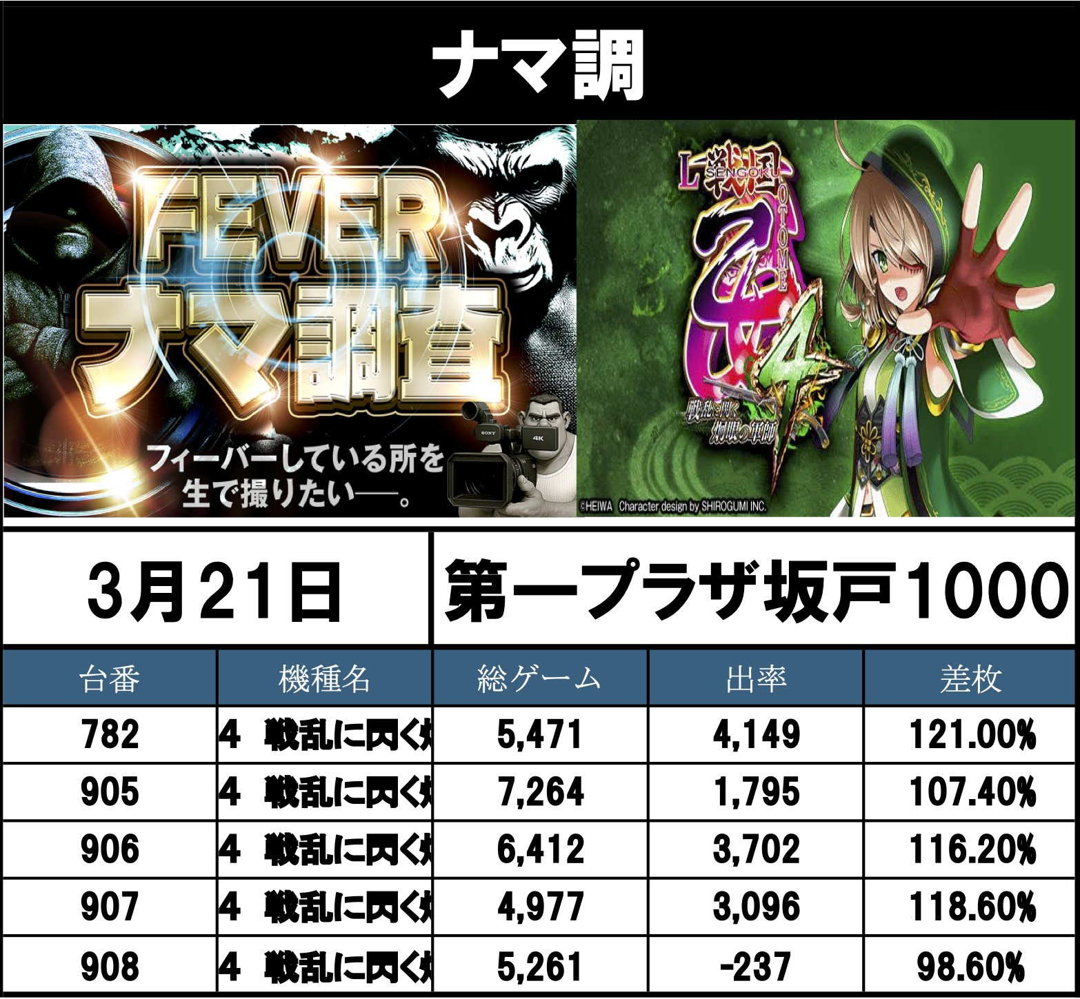 ナマ調の結果レポートになります。YouTubeチャンネル「feverナマ調」が当日の現地調査で独自に集計し注目機種の挙動をまとめたものになります。