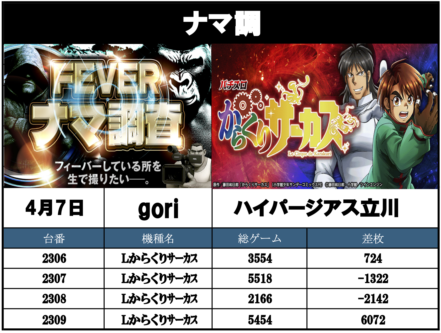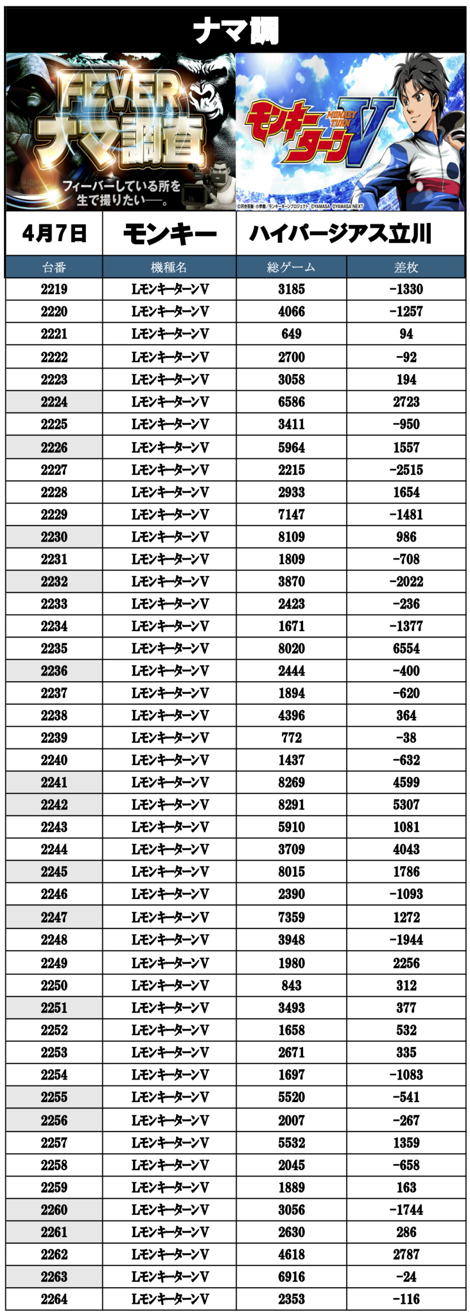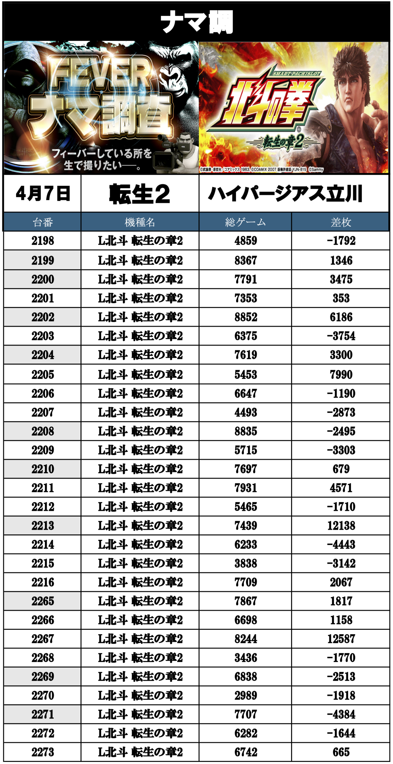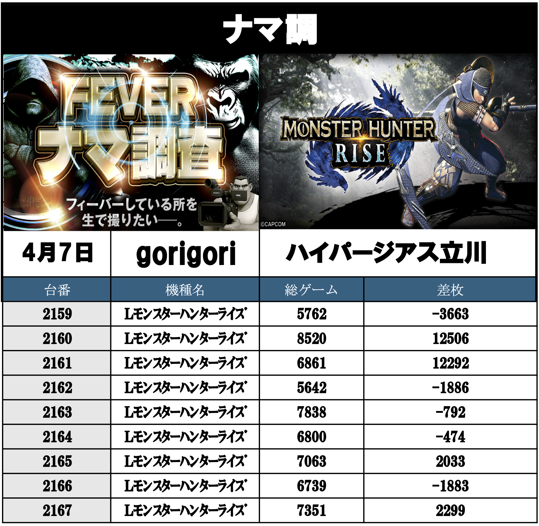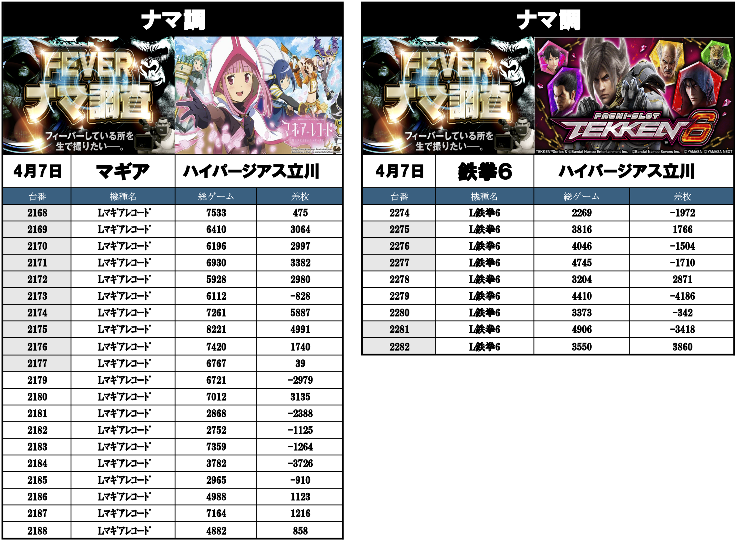 ナマ調の結果レポートになります。YouTubeチャンネル「feverナマ調」が当日の現地調査で独自に集計し注目機種の挙動をまとめたものになります。